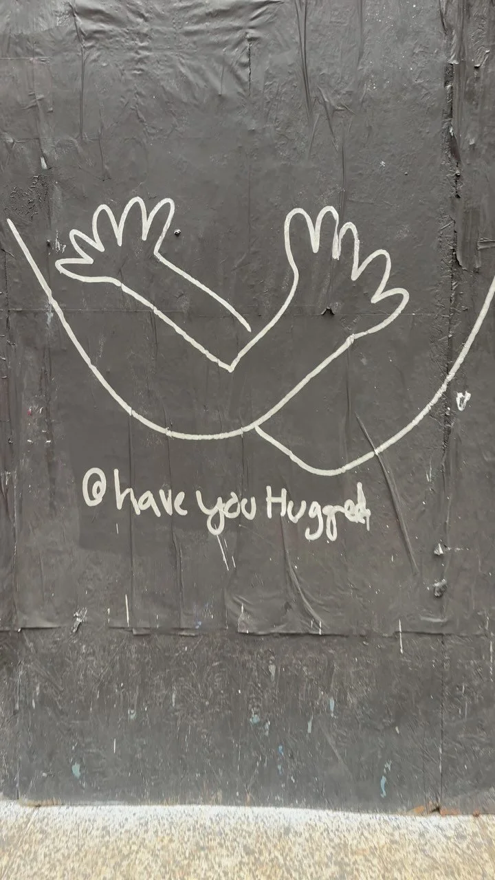 These public hugs are extensions of my studio practice in painting and sculpture. The same themes that run through my vagina and text paintings (lineage, embodiment, intimacy, reclamation) find new life in the street. The hugs translate softness into scale, transforming walls and spaces into open invitations. They echo my sewn sculptures, where limbs and full-bodied forms inhabit space like companions and provocateurs, but here, in public, they belong to everyone.